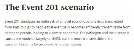 据“事件201”官网介绍,当时演习的场景是:模拟了一种新型人畜共患病冠状病毒(CAPS)的暴发。该病毒比SARS更容易传播,可能由症状较轻的个体传播。这种病毒起初由蝙蝠传播给猪,再传播给人,最终变异为可在人与人之间传播,从而导致一场传染严重的流行病。