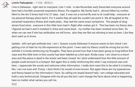 我住在特拉华州,就在马里兰州旁边,相隔1英里的样子。11月末12月初,我们这里的每个人都得了一种可怕的不明呼吸道疾病,有流感症状。我的家人就有,并且我母亲差点死于其中。去看了三次医生,症状持续了21天。很糟糕,这不是普通的流感,医生也无能为力。我那个治疗中心每个人都有这种症状。整整三周,他们都说医生们无法确定病因。我认为这种病毒先在我们这里有,然后在中国发生了变异,又传了回来。从那时起,我母亲就在隔离了。因此我们看看她是否有抗体就知道了。而且他们拒绝在这里给我们进行检测,仿佛不想让我们知道似的。