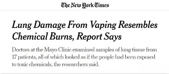 报道称,美国梅奥诊所研究了17位电子烟疾病患者的肺组织样本后,发现其损伤像是接触有毒化学物质导致的。
