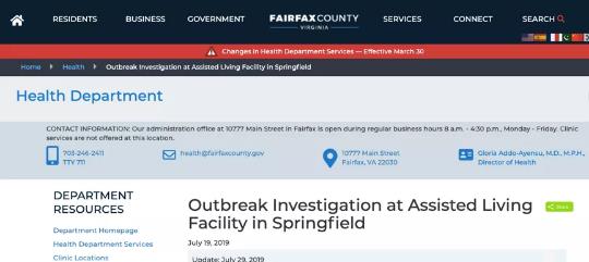 据费尔法克斯县卫生局称,2019年6月30日,“绿色春天”社区首次发现这种不明原因呼吸系统疾病的病例。截至2019年7月15日,该社区与该疾病相关的死亡病例升至3人,共计63名社区居民患病,19名工作人员也出现了症状。