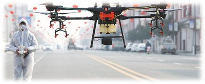 工作人员在江苏连云港市赣榆区塔山镇操作无人机对城区进行防疫消杀作业。