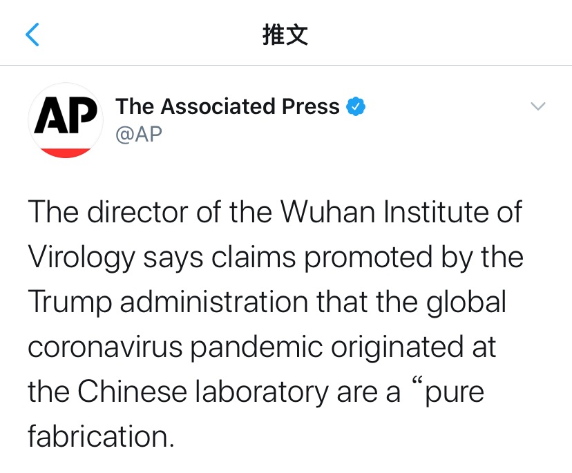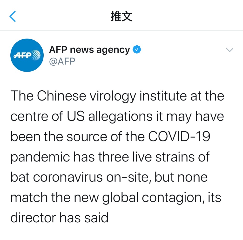 另据法新社报道,武汉病毒研究所所长说,该研究所有三株蝙蝠的冠状病毒,但它们都与目前在世界各地引发混乱的新冠病毒不相匹配。