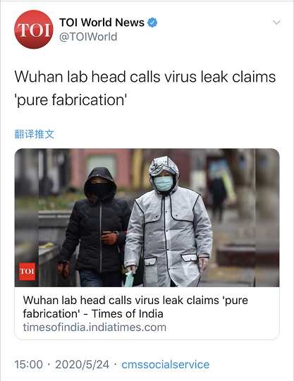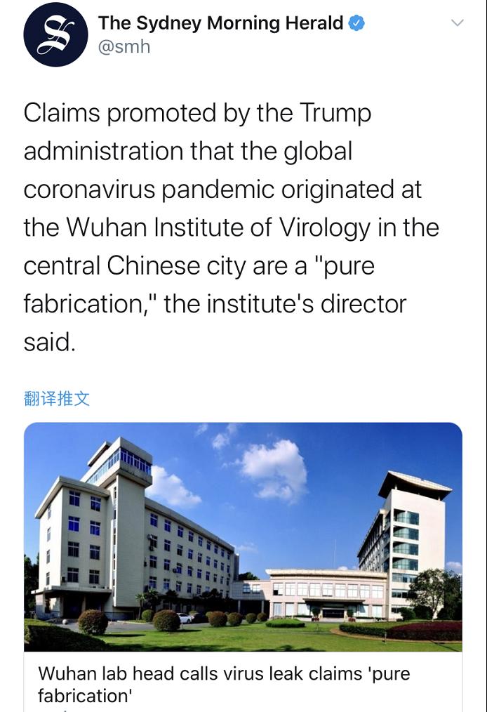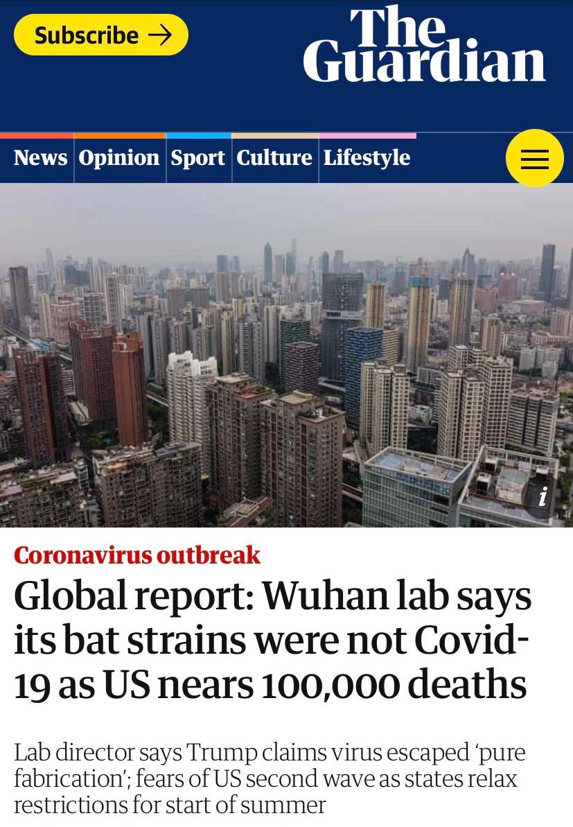 △英国媒体《卫报》报道:《武汉病毒研究所表示他们的蝙蝠毒株与新冠病毒不符》