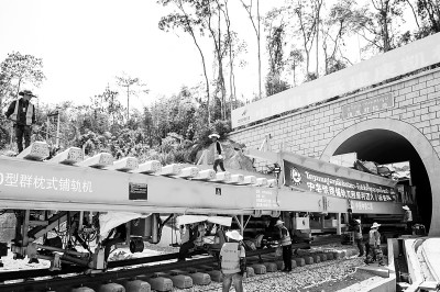 5月23日,在老挝万象省庚凯村隧道的中老铁路施工现场,中老两国工人协力铺轨。新华社发