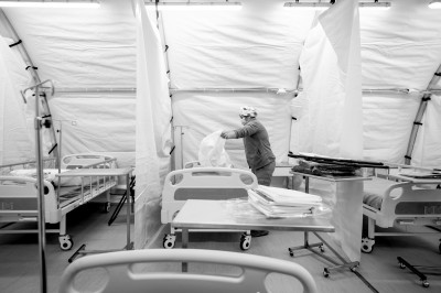 5月24日,医护人员在智利首都大区新落成的专门收治新冠患者的方舱医院内忙碌。新华社发