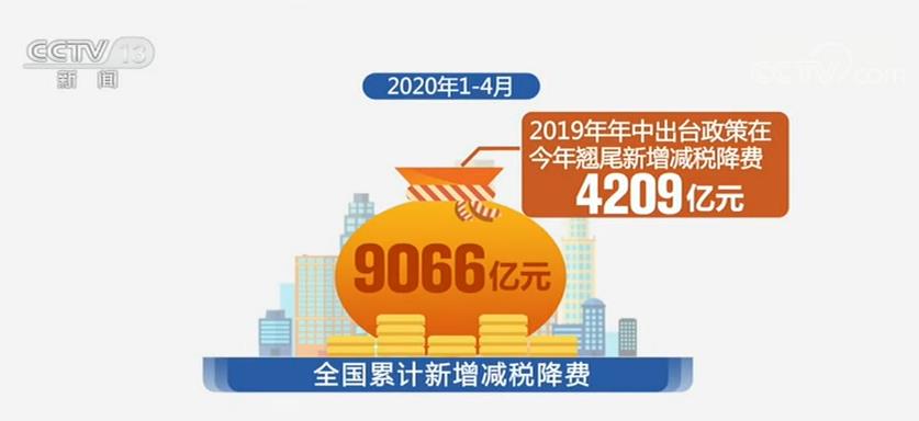 今年1至4月,全国累计新增减税降费9066亿元,其中包括2019年年中出台政策在今年翘尾新增减税降费4209亿元;2020年出台的支持疫情防控和经济社会发展税费优惠政策新增减税降费4857亿元。