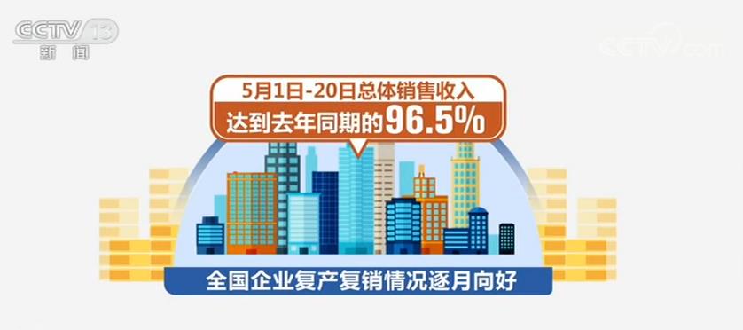 税务总局相关负责人介绍说,目前,今年新出台的减税降费政策成效已经初步显现,提振了市场主体的复工复产、复市复业信心。增值税发票数据显示:全国企业复产复销情况逐月向好,5月1日至20日总体销售收入达到去年同期的96.5%。