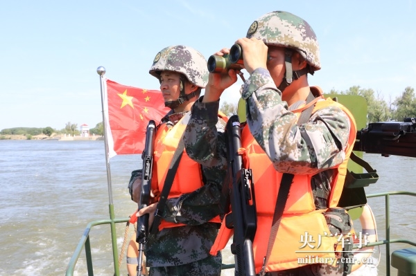 近日,连队官兵们乘艇对额尔齐斯河和39号界碑进行巡逻。上午10时,官兵们穿上救生衣,乘坐巡逻艇驶离码头。