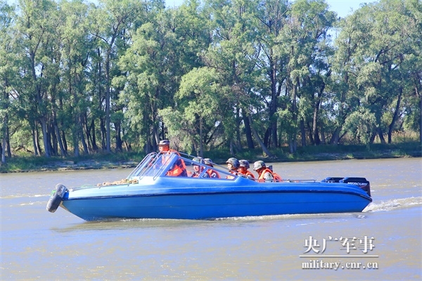 靠岸前,船艇操作手李振盛拿出船上的绳子,测量出当前水深不宜再向岸边靠近。官兵们立即返回码头改乘快艇,沿着河边一路行驶,即将抵达中哈39号界碑的浅滩附近。