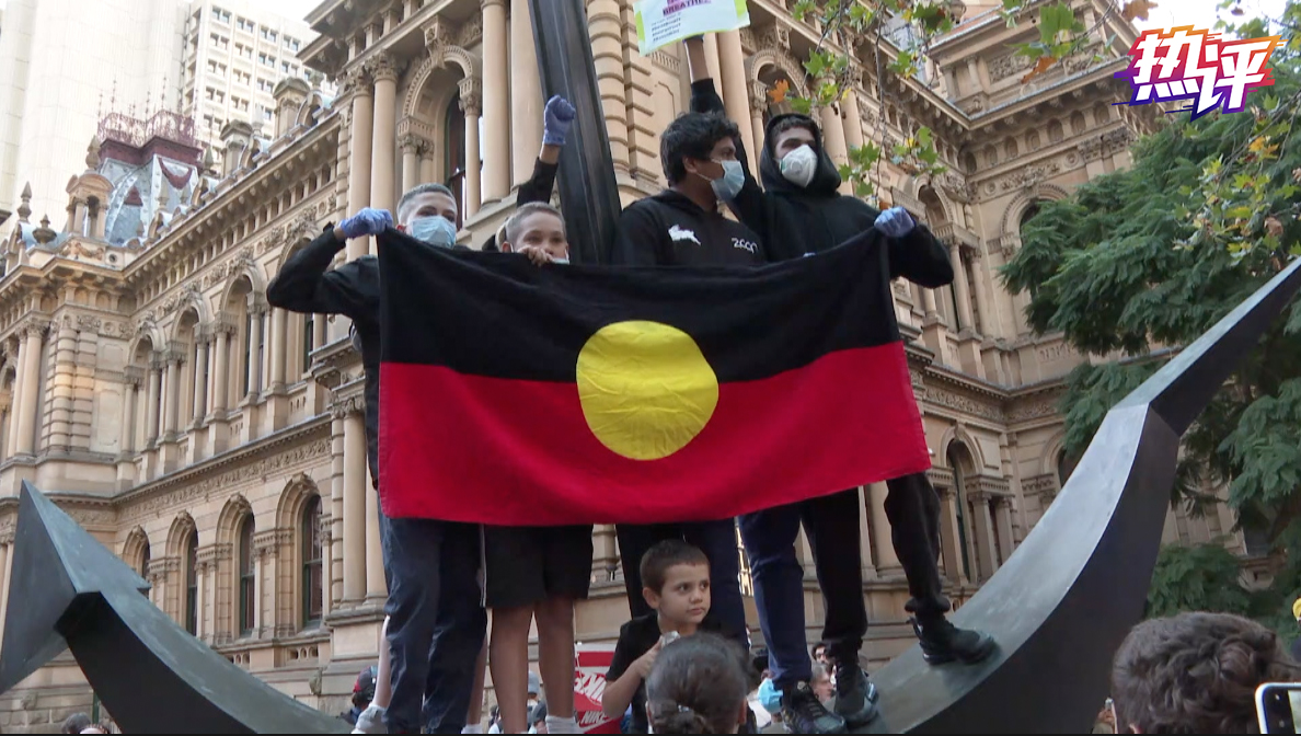 在悉尼街头的游行队伍中,不仅能看到抗议者高举写着“黑人的命也是命”的牌子,还能看到“红黄黑”三色旗,这是澳大利亚土著旗帜,游行队伍中举着土著旗帜的人们,同时也在抗议土著人遭到歧视的残酷现实。
