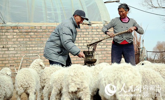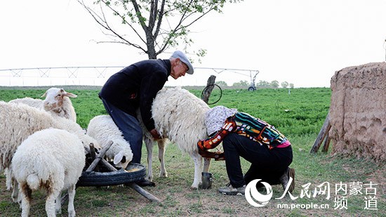 老人与妻子斯琴其木格在给羊打水。(受访对象供图)
