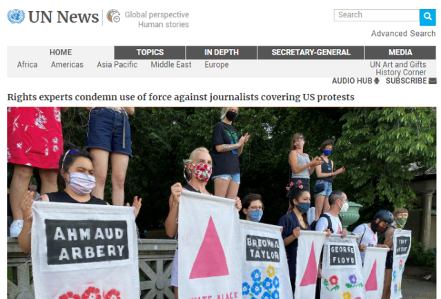 三位联合国人权专家当日发表声明,谴责美国对乔治弗洛伊德之死引发的大规模和平抗议的暴力镇压。联合国倡导言论自由权的专家谴责了美国警方打击新闻自由的暴力行为,表示美国总统特朗普对新闻媒体“长达数年的攻击”,加剧了当局和执法机构对媒体的敌对和偏见。
