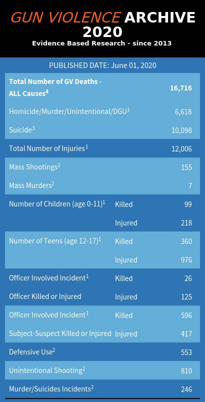 “枪支暴力档案”新闻网站6月初在社交媒体上发布了一组统计数据,显示了2020年前5个月,美国枪击事件造成6625人死亡,12043人受伤,大规模枪击案155起(4人以上受伤),有317名儿童和1336名青少年受伤或死亡。