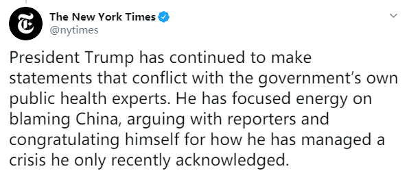 3月22日,《纽约时报》在其社交媒体发表评论:特朗普一直致力于谴责中国,与记者争吵,并表示他最近才被告知(新冠肺炎的疫情)危机,他还对自己的处理方式表示赞赏。