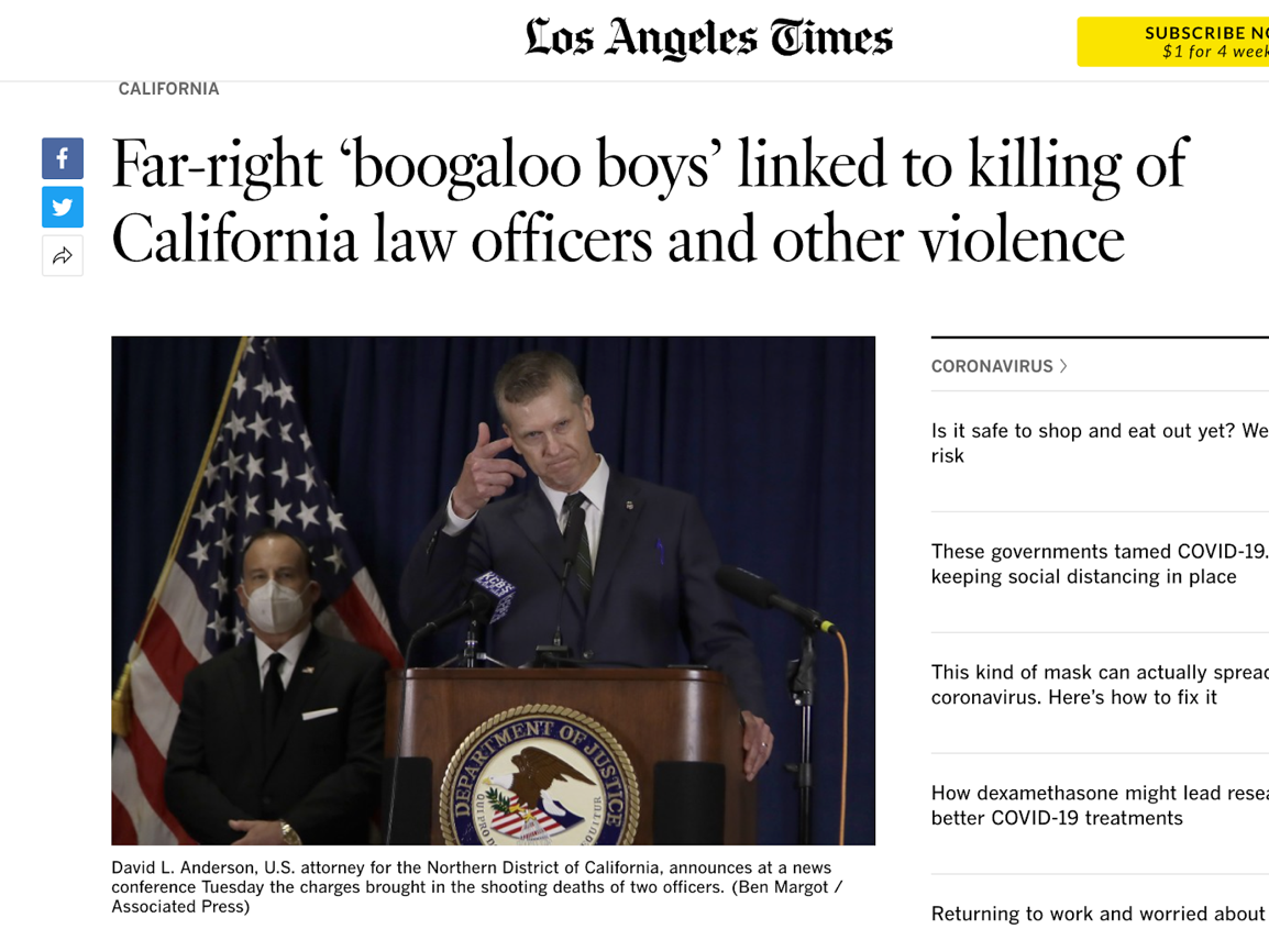 △《洛杉矶时报》报道,加州执法人员遇害事件与“布加洛”运动相关
