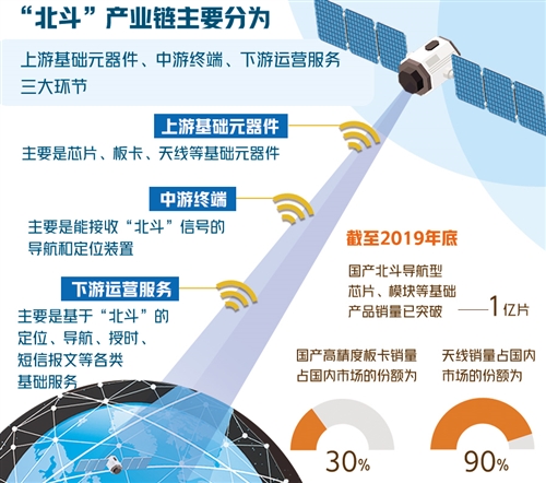 “北斗”产业链主要分为上游基础元器件、中游终端、下游运营服务3大环节。随着“北斗”与互联网、大数据、人工智能等新技术加快融合,以北斗时空信息为主要内容的新兴产业生态链正逐渐形成,并成为北斗产业快速发展的新引擎和助推器,推动生产生活方式变革和商业模式不断创新,而产业的快速发展,也将带来更大的市场空间——