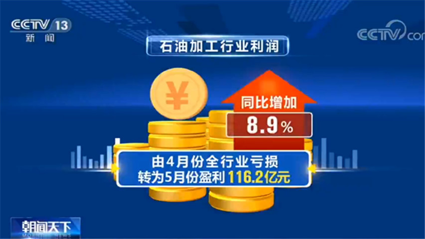 央视网消息:在成本压力减缓、市场需求改善、相关扶持政策效果显现等多重有利因素作用下,5月,石油加工、电力、化工、钢铁等重点行业利润明显改善。