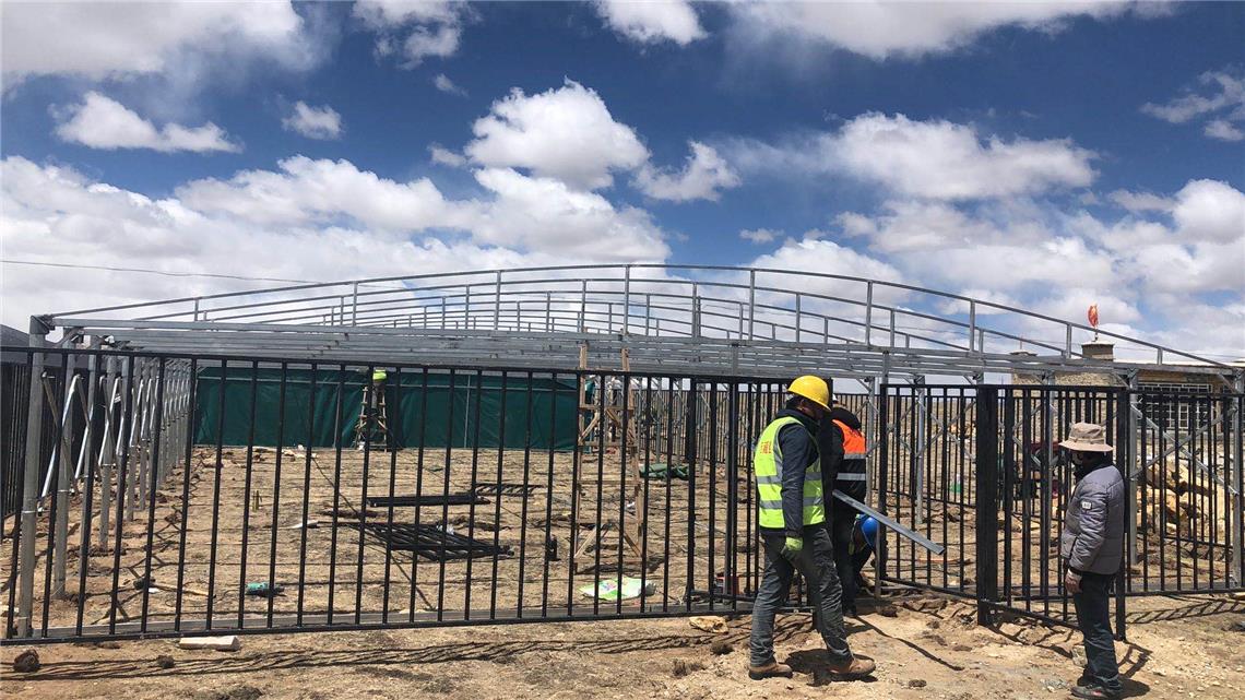虽已仲夏时节,但羌塘草原腹地的西藏那曲市班戈县德庆镇乡那村仍时有凛冽的寒风裹挟着小冰雹而至。村里林美组、热果组、美滋组的工地上,却是一派火热的施工景象,几幢装配式非补温日光生态牛羊圈舍主体结构已拔地而起。