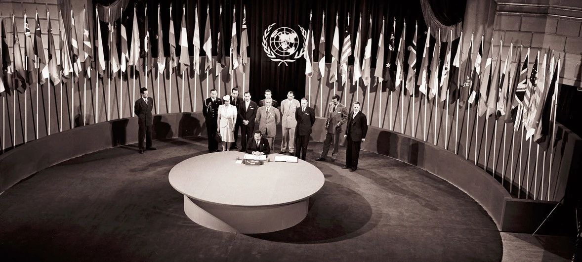 1945年6月26日,《联合国宪章》签字仪式在美国旧金山“老兵战争纪念馆”举行。图片来自联合国官网