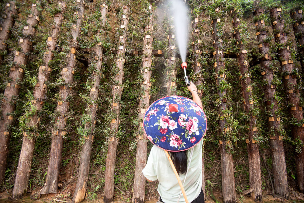 ↑6月28日,在贵州省锦屏县三江镇菜园村铁皮石斛种植基地,村民在给铁皮石斛浇水。