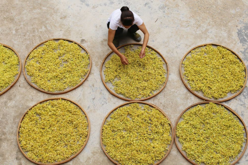 ↑6月28日,在贵州省锦屏县三江镇菜园村铁皮石斛种植基地,村民在整理采摘的石斛花。新华社发(杨晓海 摄)