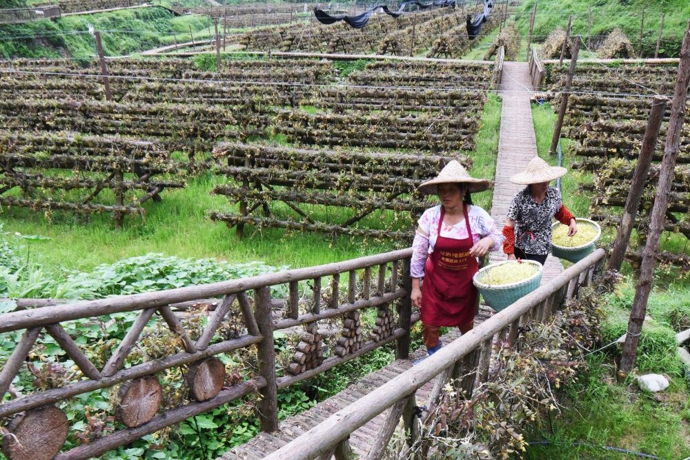 ↑6月28日,在贵州省锦屏县三江镇菜园村铁皮石斛种植基地,村民搬运采摘的石斛花。新华社发(杨晓海 摄)