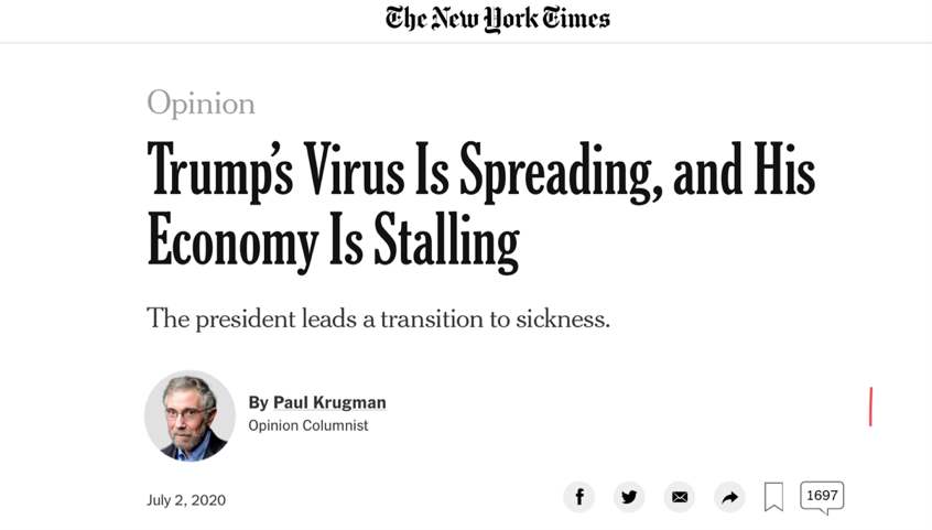 当地时间7月2日,美国《纽约时报》专栏作家保罗·克鲁格曼(Paul Krugman)发表文章,对副总统迈克·彭斯宣称的政府抗疫成果提出质疑。