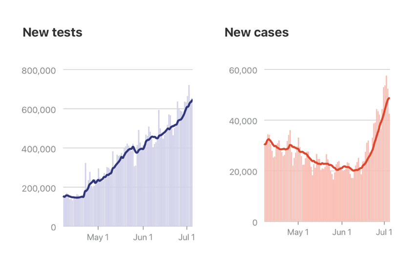 △美国检测数量与每日新增病例数量对比图 (图片来源:“新冠病毒追踪计划”网站)