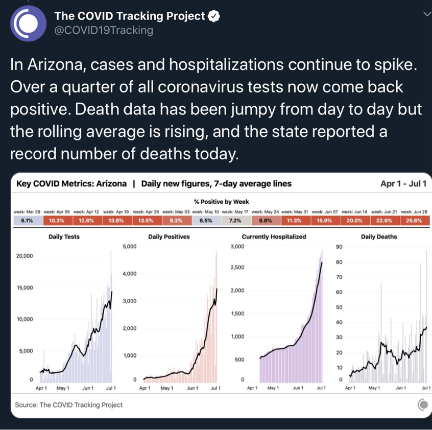 △亚利桑那州从4月1日到7月1日每日新增确诊病例数、每日死亡人数、住院人数与每日新增死亡人数的变化 (图片来源:“新冠病毒追踪计划”网站)