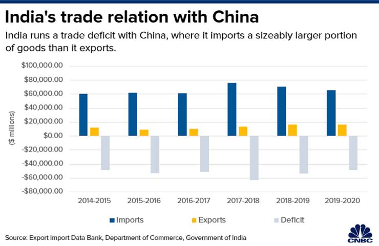 数据显示,在2019年4月至2020年3月期间,印度从中国进口了价值超过650亿美元的商品,出口了价值约166亿美元的商品。