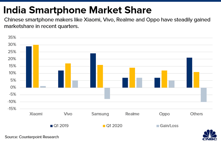 印度拥有全球庞大的智能手机市场。据全球知名市场调研机构Counterpoint Research的数据显示,印度前五大智能手机品牌中,有四个是中国品牌,占了约80%的市场份额,而印度本土品牌只占1%。