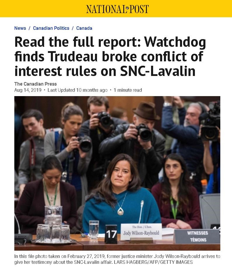 △加拿大《国家邮报》2019年8月4日报道道德专员认定特鲁多曾在兰万灵公司案的处理上违法