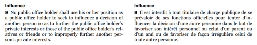 △加拿大《利益冲突法》中有关于公职人员不得影响他人以谋取私利的明文规定