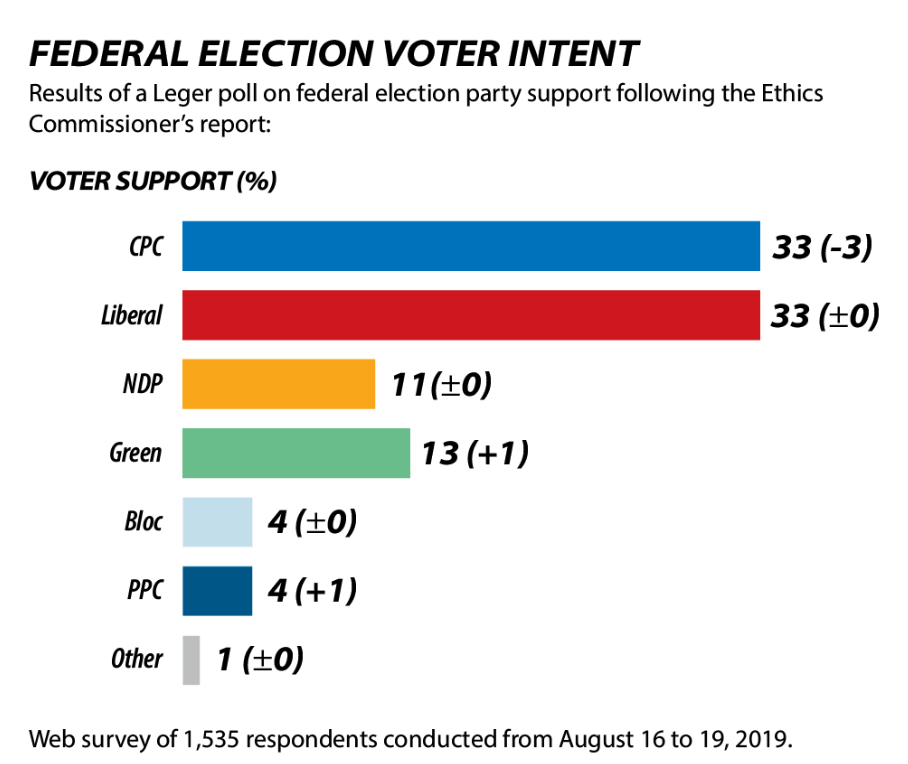 △2019年8月在道德专员作出特鲁多违反《利益冲突法》的结论后的民调结果