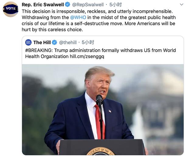 当地时间7月7日,美国众议员埃里克·斯瓦尔威尔在社交平台上称,(美国)退出世卫的决定是不负责任、鲁莽和完全不可理解的。在有生之年最严重的公共卫生危机中退出世卫组织是一个自我毁灭的做法。更多的美国人会因为这个草率的决定而受到伤害。