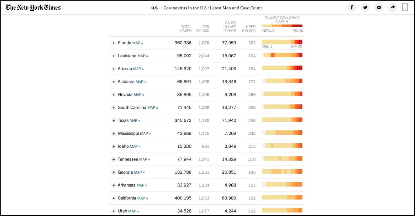 △《纽约时报》统计显示,得克萨斯州、佛罗里达州上周新增确诊病例均超7万