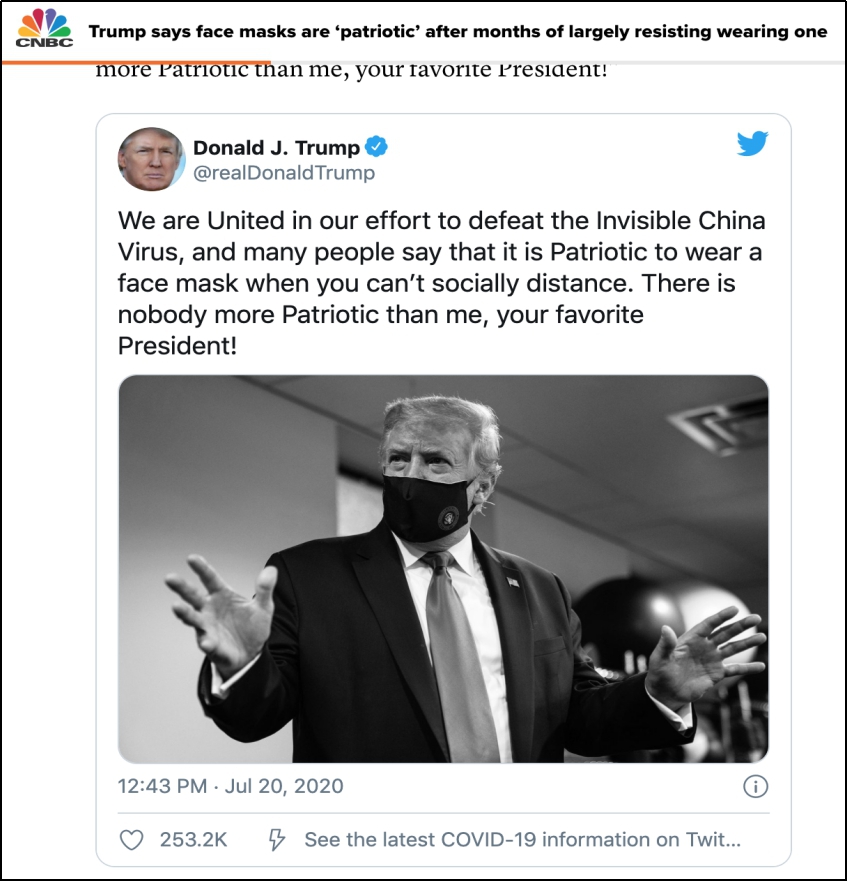 各州急忙搬出口罩令并非偶然。目前,美国社会对口罩的看法已经开始扭转。特朗普7月20日发推文说:“当你无法保持社交距离时,戴口罩就是爱国。”此前几个月,特朗普一直不肯在公开场合戴口罩,但在各方压力之下,他对口罩的态度已经发生了大转弯。此外,国会共和党人也在多个场合呼吁民众戴口罩。