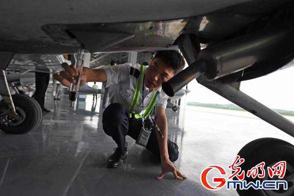 训练机起飞前,飞行学员们正在检查机身状况。光明网记者 潘迪摄