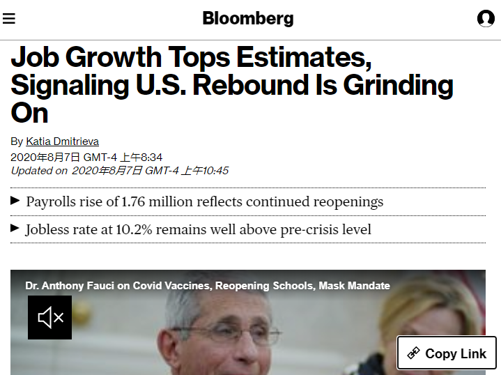 例如,美国7月非农业部门就业人口环比增加176.3万,但较6月增加的480万大幅下降;失业率虽降至10.2%,但仍处于历史高位,高于2008年金融危机引发经济衰退期间于2009年10月达到的峰值10%。