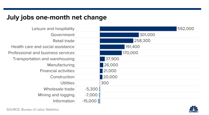 美国劳工部表示,劳动力市场的改善反映了因冠状病毒大流行及经济封锁措施而减少的经济活动继续复苏。7月,休闲和酒店、政府、零售、医疗保健和社会援助、专业和商业服务等领域的就业岗位显著增加。