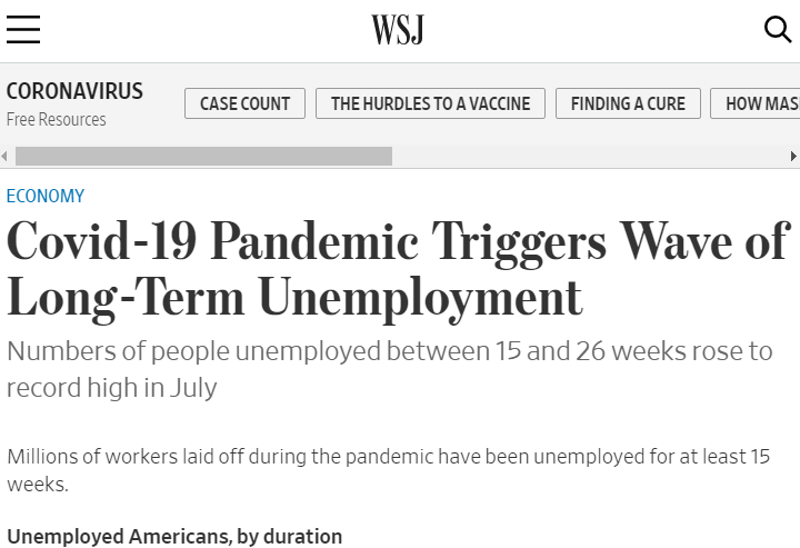 《华尔街日报》指出,越来越多的工人在7月失业超过3个月,表明疫情可能会对许多人产生持久的经济影响。这是一个不祥的信号,意味着即使整体招聘情况有所改善,也会有数百万工人面临长期失业的前景。