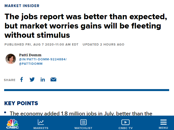 △CNBC称,美国7月就业报告好于预期,但市场担心,在没有新一轮经济刺激计划的情况下,劳动力市场很难持续改善