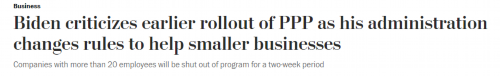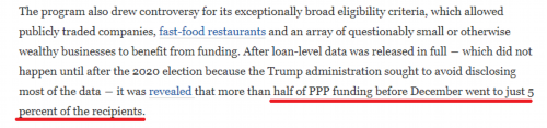 据《华盛顿邮报》报道,自美国政府去年4月开始第一轮疫情救助以来,PPP计划已批准数百万笔贷款。但该计划因其“特别宽泛”的贷款资格标准,反而让一些上市公司和其实并不缺钱的企业得了好处。一直被特朗普政府拖到2020年大选后才公布的数据显示,到去年12月前,超过一半的PPP资金只流向了占接受救助企业5%的企业。