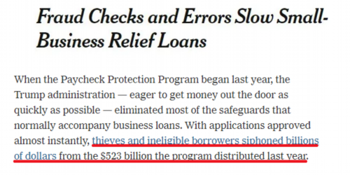另据《纽约时报》报道,特朗普政府当时急于“发钱”,取消了通常伴随企业贷款应有的大部分安全步骤。由于相关申请几乎会立即获得批准,众多“小偷”和不符合条件的借款人从去年已经发放的5230亿美元PPP贷款中抽走了数十亿美元。