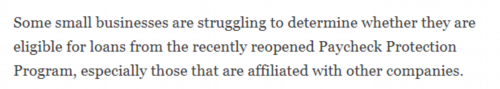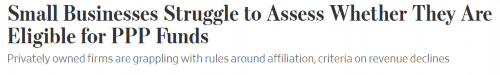 据《华尔街日报》报道,白宫出台新规后,很多小企业、尤其是那些与其他公司有关联的企业正在努力确认自己是否有资格从本轮PPP计划中获得贷款,包括弄清有关商业隶属关系的判定规则以及衡量企业收入下降的计算标准。