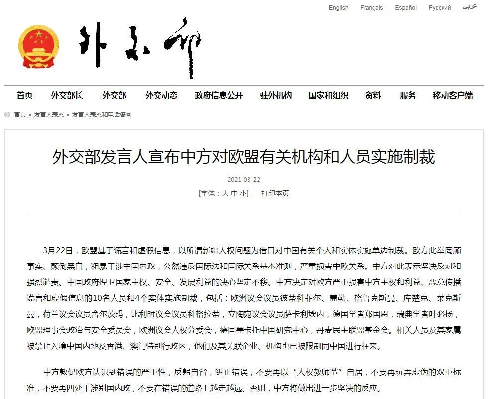 当天,欧盟、英国、加拿大分别以所谓新疆人权问题为借口,宣布对有关个人及实体实施单边制裁。同日,美国宣布对中方制裁,声称是对欧、英、加制裁措施的补充。美、英、加三国外长发表联合声明,向中方施压。