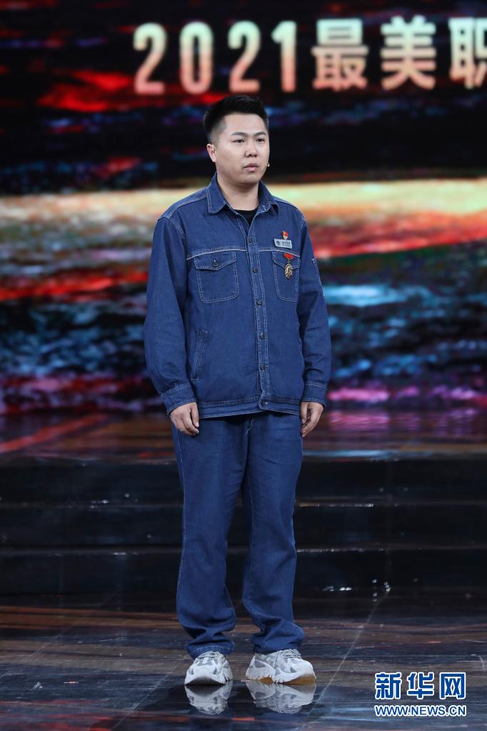 国网内蒙古东部电力有限公司检修分公司锡林郭勒盟输电工区输电运检七班技术员包文杰在北京举行的2021年“最美职工”发布仪式现场(4月22日摄)。新华社发(吴凡 摄)