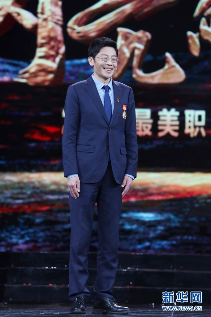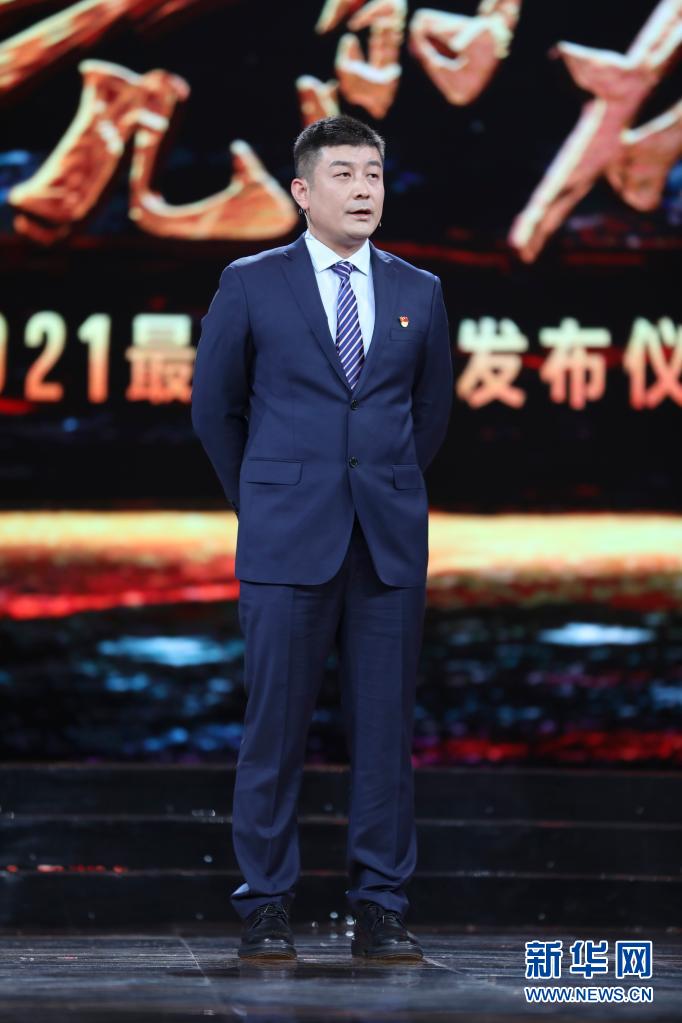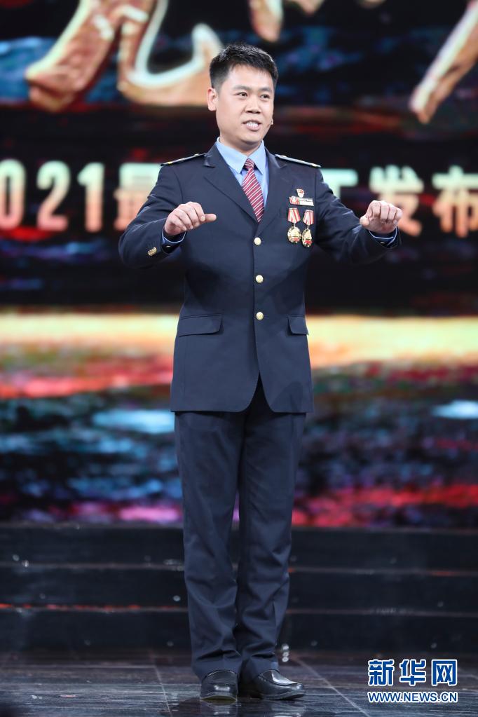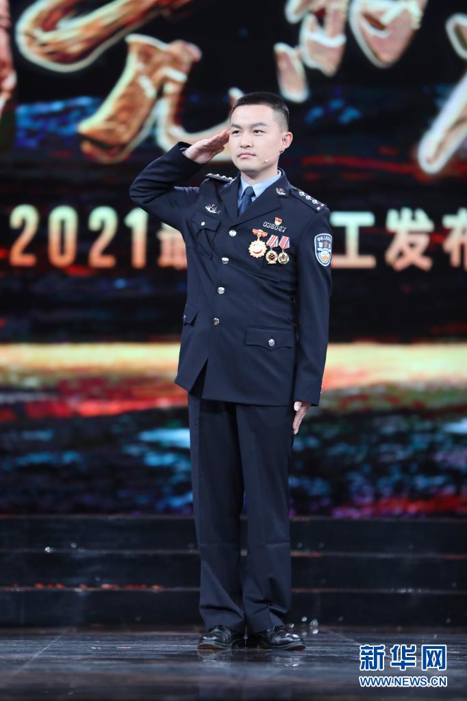 湖北省武汉市公安局蔡甸区分局大集街派出所副所长燕占飞在北京举行的2021年“最美职工”发布仪式现场(4月22日摄)。新华社发(吴凡 摄)