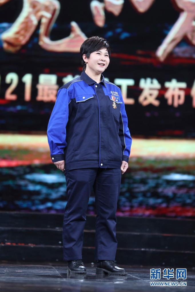 江西金力永磁科技股份有限公司生产车间的成型压机操作能手温小珍在北京举行的2021年“最美职工”发布仪式现场(4月22日摄)。新华社发(吴凡 摄)