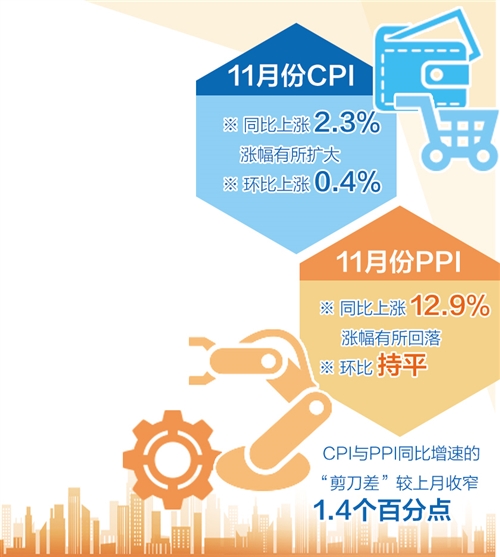12月9日,国家统计局发布的11月份全国居民消费价格指数(CPI)和工业生产者出厂价格指数(PPI)显示,11月份,CPI同比上涨2.3%,涨幅有所扩大;环比上涨0.4%。随着保供稳价政策落实力度不断加大,PPI同比上涨12.9%,涨幅有所回落;环比持平。CPI与PPI同比增速的“剪刀差”为10.6个百分点,较上月收窄1.4个百分点。